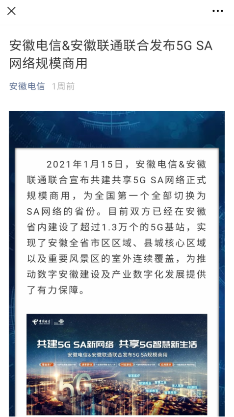 而且另外一家运营商中国电信最近也官宣了5G SA网络规模商用,并邀请用户免费升级为SA网络。而且为了鼓励大家提升网络体验,还设置了流量抽奖,只要打开SA开关并产生5G流量(5G登网)48小时后即可参与,最高可抽中10G流量。(开通方法:在安徽电信微信公众号回复“5G SA”即可获取)