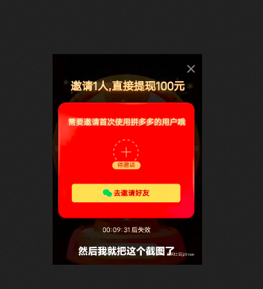 事情是这样的,有网友在微博称自己是拼多多用户,在一次打开拼多多APP后发现首页有一个“邀请1人,直接提现100元”的活动,于是把活动图片截图保存在手机相册。