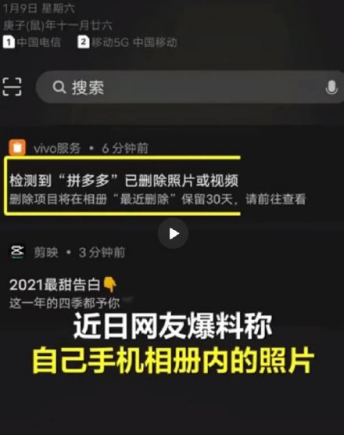 这时不可思议的事情出现了,过了一会该网友的手机系统弹出提示:“检测到‘拼多多’已删除照片或视频。”